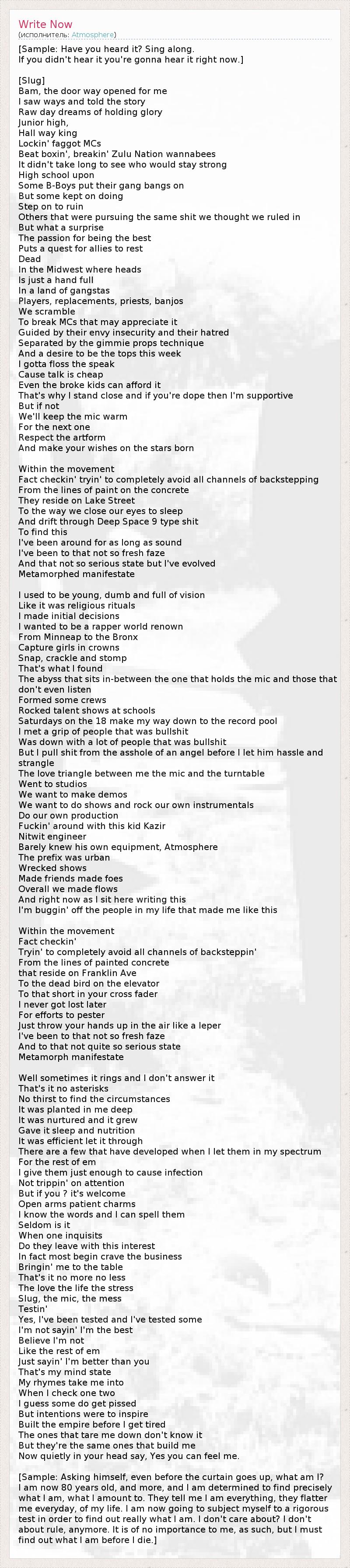 Это интересно:«Atmosphere» - одна из популярнейших групп в американском независимом хип-хопе. Группу создали в 1993-м году Sean Daley, известный как Slug и Spawn (Derek Turner, сейчас известный как «Rek The Heavyweight»). Последний покинул группу после выхода их первого альбома «Overcast!»В старших классах школы Sean Daley с другом Brent Sayer решили создать группу. Взяв для этой цели псевдонимы Slug (взял псевдоним от клички своего отца - Sluggo)... продолжение