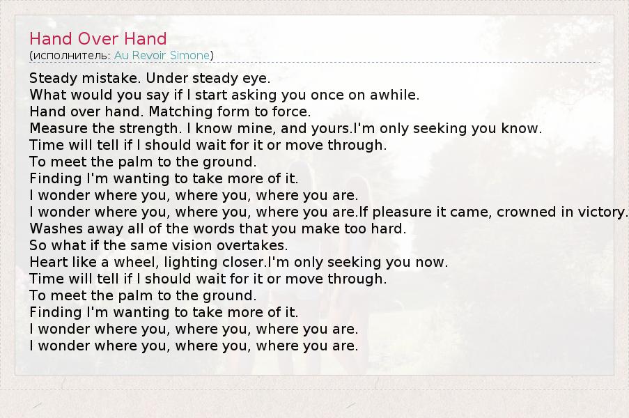 А как ты думаешь, о чем песня "Hand Over Hand" ?