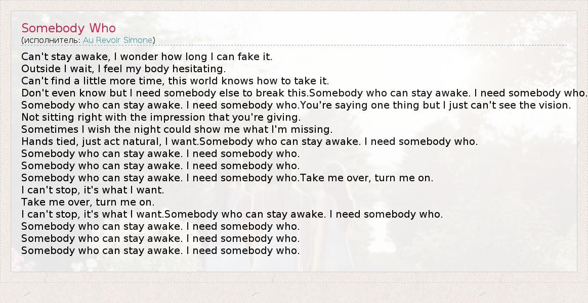 I can't stop, it's what I want.Somebody who can stay awake. I need somebody who.