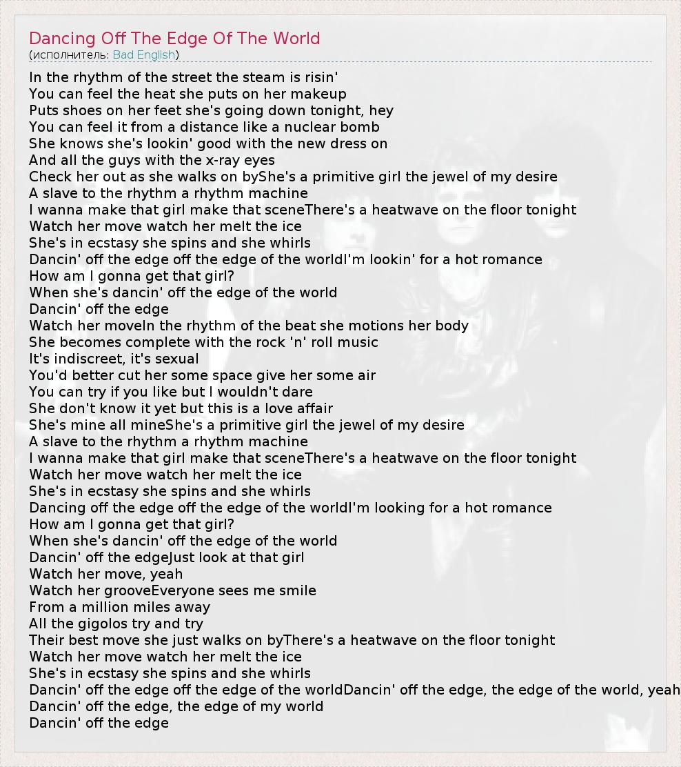 Dancin' off the edge off the edge of the worldDancin' off the edge, the edge of the world, yeah