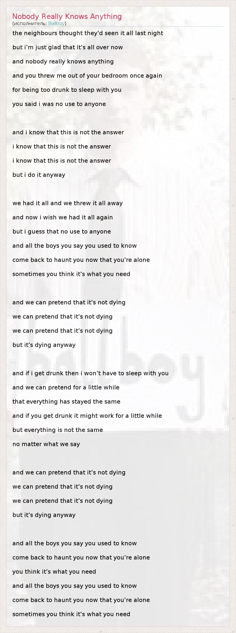 the neighbours thought they'd seen it all last night but i'm just glad that it's all over now and nobody really knows anything and you threw me out of your bedroom once again for being too drunk to sleep with you you said i was no use to anyone and i know that this is not the answer i know that this is not the answer i know that this is not the answer but i do it anyway we had it all and we threw it all away and now i wish we had it all again but i guess that no use to anyone and all the boys you say you used to know come back to haunt you now that you're alone sometimes you think it's what you need and we can pretend that it's not dying we can pretend that it's not dying we can pretend that it's not dying but it's dying anyway and if i get drunk then i won't have to sleep with you and we can pretend for a little while that everything has stayed the same and if you get drunk it might work for a little while but everything is not the same no matter what we say and we can pretend that it's not dying we can pretend that it's not dying we can pretend that it's not dying but it's dying anyway and all the boys you say you used to know come back to haunt you now that you're alone you think it's what you need and all the boys you say you used to know come back to haunt you now that you're alone sometimes you think it's what you need