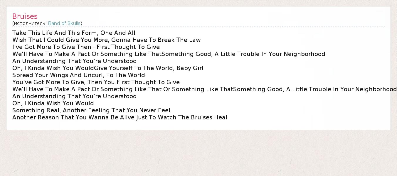 Take This Life And This Form, One And All Wish That I Could Give You More, Gonna Have To Break The Law I've Got More To Give Then I First Thought To Give We'll Have To Make A Pact Or Something Like ThatSomething Good, A Little Trouble In Your Neighborhood An Understanding That You're Understood Oh, I Kinda Wish You WouldGive Yourself To The World, Baby Girl Spread Your Wings And Uncurl, To The World You've Got More To Give, Then You First Thought To Give We'll Have To Make A Pact Or Something Like That Or Something Like ThatSomething Good, A Little Trouble In Your Neighborhood An Understanding That You're Understood Oh, I Kinda Wish You Would Something Real, Another Feeling That You Never Feel Another Reason That You Wanna Be Alive Just To Watch The Bruises Heal