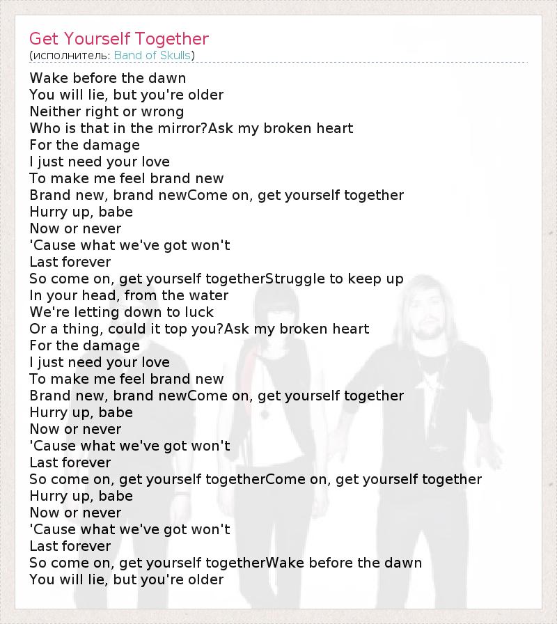 Wake before the dawn You will lie, but you're older Neither right or wrong Who is that in the mirror?Ask my broken heart For the damage I just need your love To make me feel brand new Brand new, brand newCome on, get yourself together Hurry up, babe Now or never 'Cause what we've got won't Last forever So come on, get yourself togetherStruggle to keep up In your head, from the water We're letting down to luck Or a thing, could it top you?Ask my broken heart For the damage I just need your love To make me feel brand new Brand new, brand newCome on, get yourself together Hurry up, babe Now or never 'Cause what we've got won't Last forever So come on, get yourself togetherCome on, get yourself together Hurry up, babe Now or never 'Cause what we've got won't Last forever So come on, get yourself togetherWake before the dawn You will lie, but you're older
