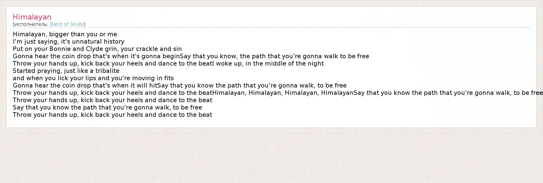 Himalayan, bigger than you or me I'm just saying, it's unnatural history Put on your Bonnie and Clyde grin, your crackle and sin Gonna hear the coin drop that's when it's gonna beginSay that you know, the path that you're gonna walk to be free Throw your hands up, kick back your heels and dance to the beatI woke up, in the middle of the night Started praying, just like a tribalite and when you lick your lips and you're moving in fits Gonna hear the coin drop that's when it will hitSay that you know the path that you're gonna walk, to be free Throw your hands up, kick back your heels and dance to the beatHimalayan, Himalayan, Himalayan, HimalayanSay that you know the path that you're gonna walk, to be free Throw your hands up, kick back your heels and dance to the beat Say that you know the path that you're gonna walk, to be free Throw your hands up, kick back your heels and dance to the beat