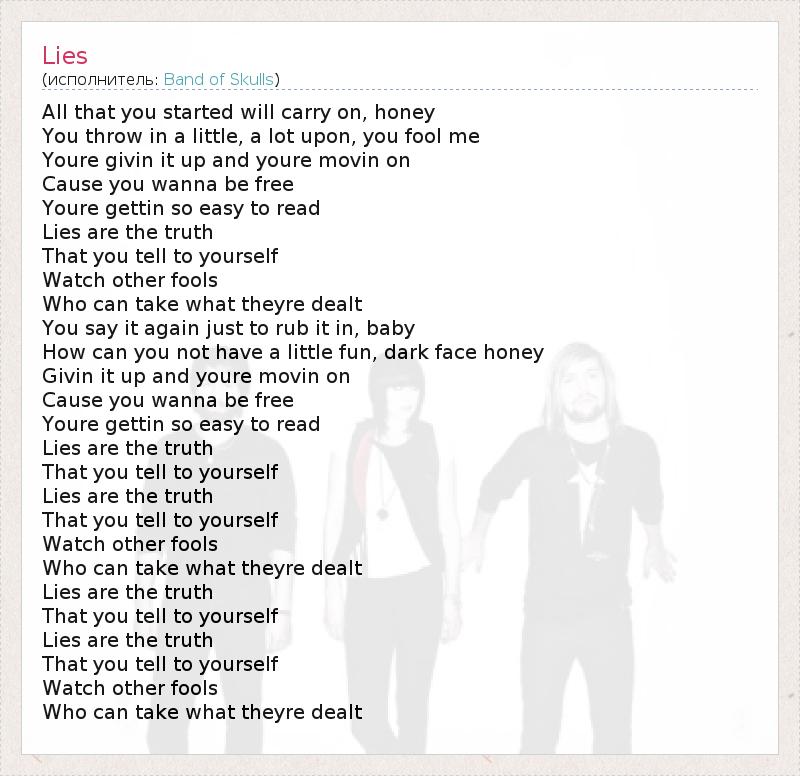 Это интересно:Участники группы Band of Skulls Расселл Марсден (Russell Marsden) (гитара и вокал), Эмма Ричардсон (Emma Richardson) (бас-гитара и вокал) и Мэтт Хэйвард (Matt Hayward) (ударные) познакомились в колледже и быстро обнаружили, что наличие двух ведущих певцов и троих композиторов всегда представляет неограниченные возможности. Первоначально они играли в ночных клубах и записали несколько демо под названием "Fleeing... продолжение