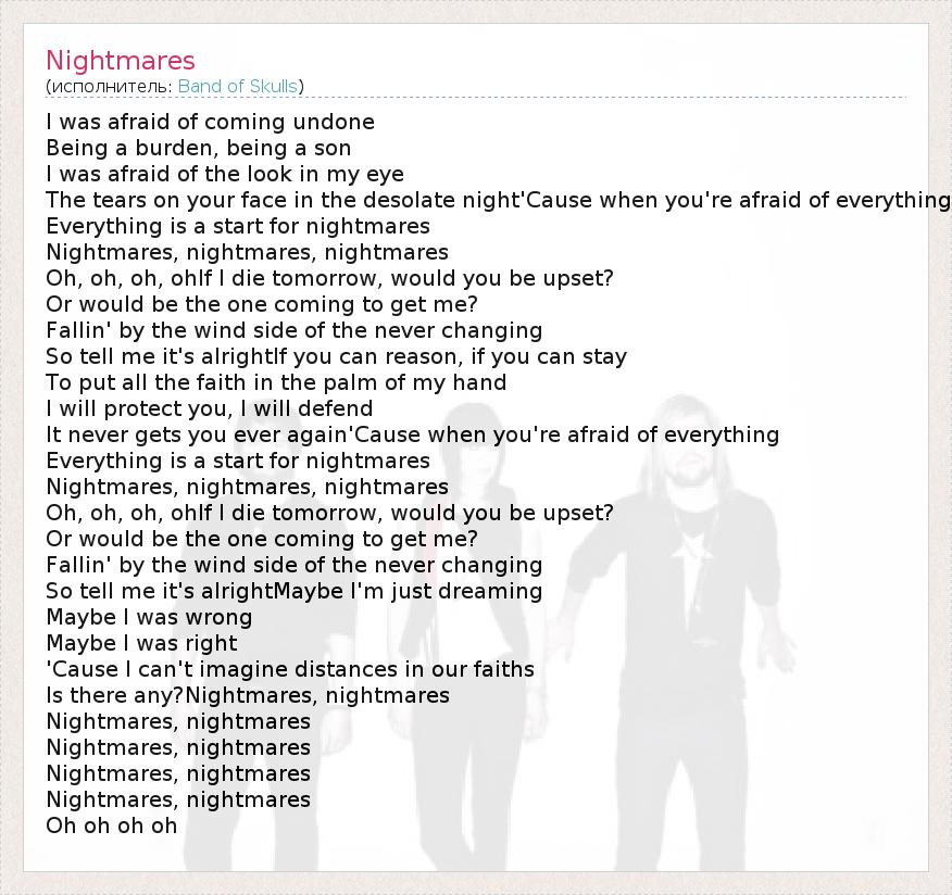 I was afraid of coming undone Being a burden, being a son I was afraid of the look in my eye The tears on your face in the desolate night'Cause when you're afraid of everything Everything is a start for nightmares Nightmares, nightmares, nightmares Oh, oh, oh, ohIf I die tomorrow, would you be upset? Or would be the one coming to get me? Fallin' by the wind side of the never changing So tell me it's alrightIf you can reason, if you can stay To put all the faith in the palm of my hand I will protect you, I will defend It never gets you ever again'Cause when you're afraid of everything Everything is a start for nightmares Nightmares, nightmares, nightmares Oh, oh, oh, ohIf I die tomorrow, would you be upset? Or would be the one coming to get me? Fallin' by the wind side of the never changing So tell me it's alrightMaybe I'm just dreaming Maybe I was wrong Maybe I was right 'Cause I can't imagine distances in our faiths Is there any?Nightmares, nightmares Nightmares, nightmares Nightmares, nightmares Nightmares, nightmares Nightmares, nightmares Oh oh oh oh