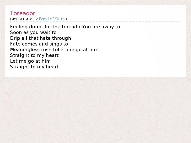 Feeling doubt for the toreadorYou are away to Soon as you wait to Drip all that hate through Fate comes and sings to Meaningless rush toLet me go at him Straight to my heart Let me go at him Straight to my heart