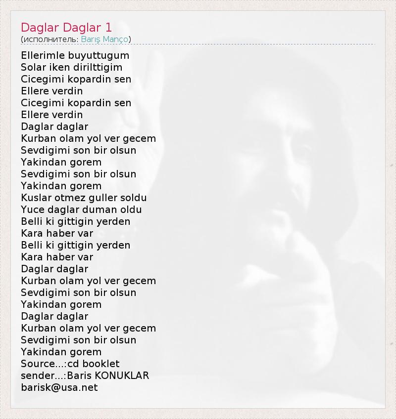 Это интересно:Барыш Манчо (2 января 1943 - 1 февраля 1999) - турецкий рок-певец, композитор и телепродюсер. Им написано около 200 песен, некоторые из которых были переведены на разные языки: английский, японский, греческий, болгарский, румынский, персидский и арабский. Барыш Манчо и по сей день остается одной из самых популярных общественных фигур Турции. Если исполняется песня, написанная Барышем Манчо, турки... продолжение