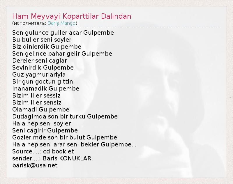 ГлавнаяИсполнителиBarış MançoHam Meyvayi Koparttilar Dalindan