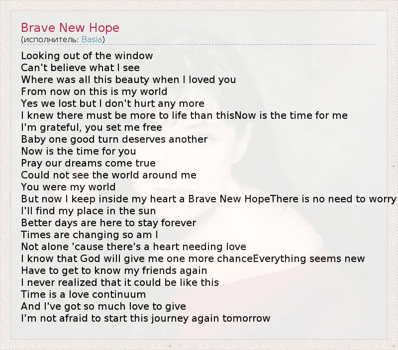 But now I keep inside my heart a Brave New HopeThere is no need to worry