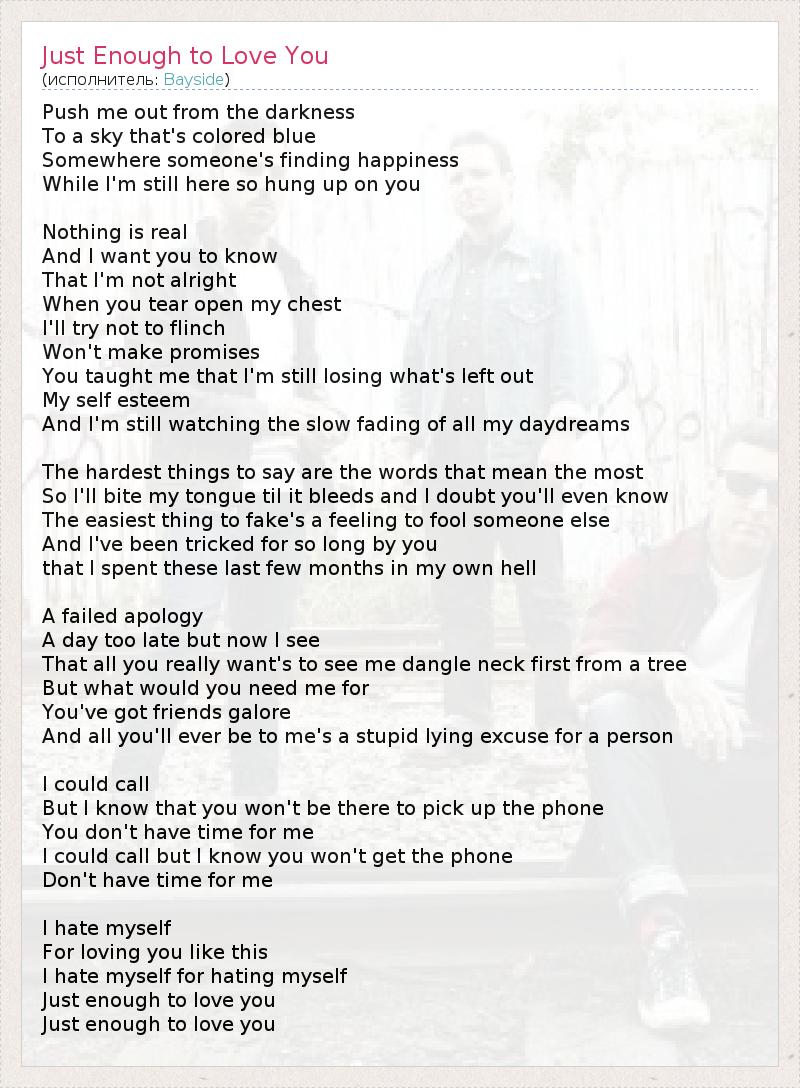 Push me out from the darkness To a sky that's colored blue Somewhere someone's finding happiness While I'm still here so hung up on you Nothing is real And I want you to know That I'm not alright When you tear open my chest I'll try not to flinch Won't make promises You taught me that I'm still losing what's left out My self esteem And I'm still watching the slow fading of all my daydreams The hardest things to say are the words that mean the most So I'll bite my tongue til it bleeds and I doubt you'll even know The easiest thing to fake's a feeling to fool someone else And I've been tricked for so long by you that I spent these last few months in my own hell A failed apology A day too late but now I see That all you really want's to see me dangle neck first from a tree But what would you need me for You've got friends galore And all you'll ever be to me's a stupid lying excuse for a person I could call But I know that you won't be there to pick up the phone You don't have time for me I could call but I know you won't get the phone Don't have time for me I hate myself For loving you like this I hate myself for hating myself Just enough to love you Just enough to love you