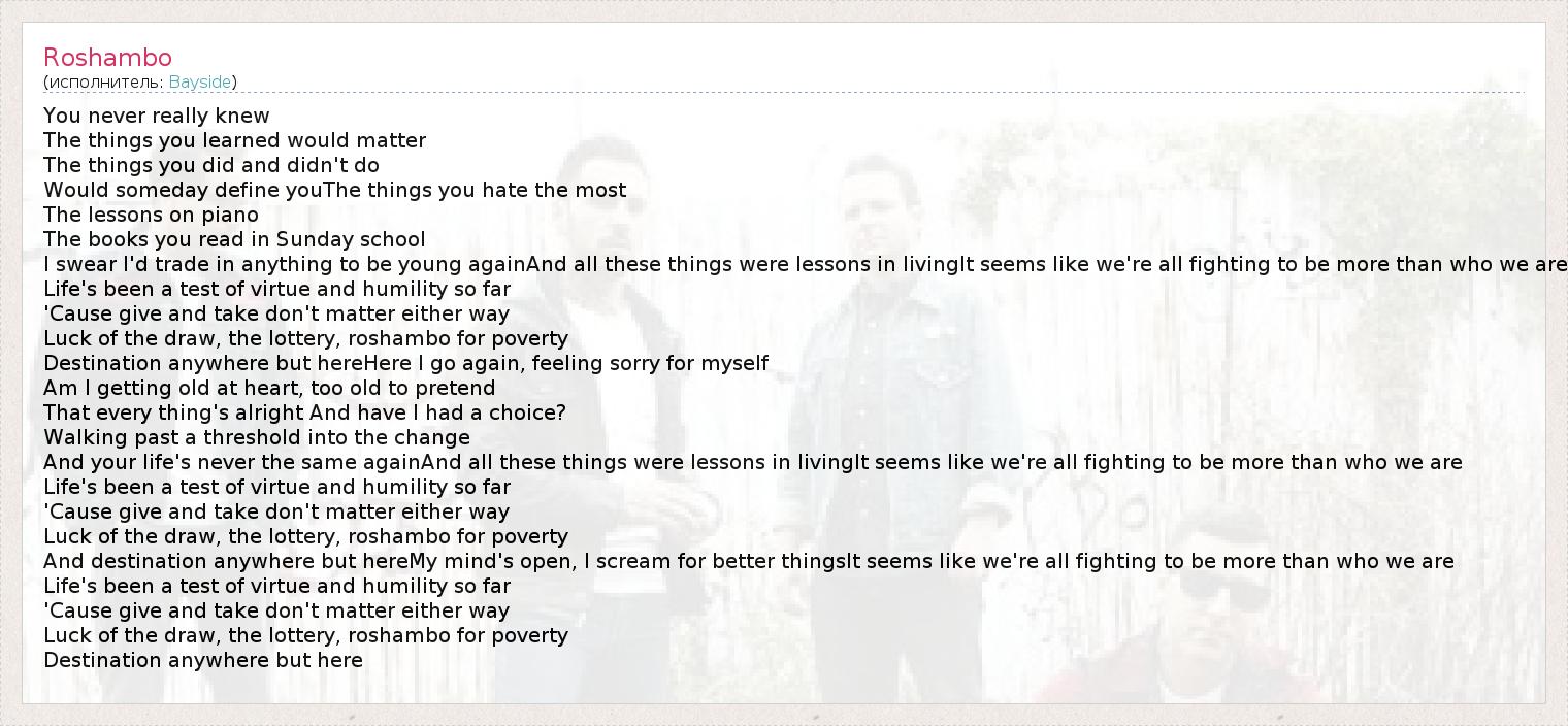 Это интересно:Американские рокеры «Bayside» собрались зимой 2000 года в Бэйсайде, Нью Йорк. Вскоре после своего формирования, группа уже делила сцену с именитыми коллегами «Alkaline Trio», «Taking Back Sunday» и «The Used», чем собственно и обратила на себя внимание бруклинского лэйбла «Dying Wish Records» выпустившего в последствии первый ЕР «Long Stories Short».В период с 2001 по 2002 группа «Bayside» продолжила свою концертную деятельность,... продолжение