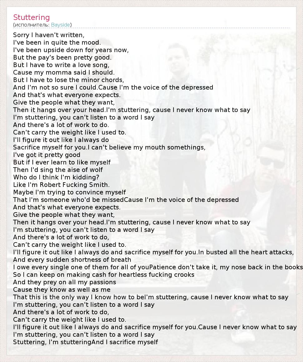 Sorry I haven't written, I've been in quite the mood. I've been upside down for years now, But the pay's been pretty good. But I have to write a love song, Cause my momma said I should. But I have to lose the minor chords, And I'm not so sure I could.Cause I'm the voice of the depressed And that's what everyone expects. Give the people what they want, Then it hangs over your head.I'm stuttering, cause I never know what to say I'm stuttering, you can't listen to a word I say And there's a lot of work to do. Can't carry the weight like I used to. I'll figure it out like I always do Sacrifice myself for you.I can't believe my mouth somethings, I've got it pretty good But if I ever learn to like myself Then I'd sing the aise of wolf Who do I think I'm kidding? Like I'm Robert Fucking Smith. Maybe I'm trying to convince myself That I'm someone who'd be missedCause I'm the voice of the depressed And that's what everyone expects. Give the people what they want, Then it hangs over your head.I'm stuttering, cause I never know what to say I'm stuttering, you can't listen to a word I say And there's a lot of work to do, Can't carry the weight like I used to. I'll figure it out like I always do and sacrifice myself for you.In busted all the heart attacks, And every sudden shortness of breath I owe every single one of them for all of youPatience don't take it, my nose back in the books So I can keep on making cash for heartless fucking crooks And they prey on all my passions Cause they know as well as me That this is the only way I know how to beI'm stuttering, cause I never know what to say I'm stuttering, you can't listen to a word I say And there's a lot of work to do, Can't carry the weight like I used to. I'll figure it out like I always do and sacrifice myself for you.Cause I never know what to say I'm stuttering, you can't listen to a word I say Stuttering, I'm stutteringAnd I sacrifice myself