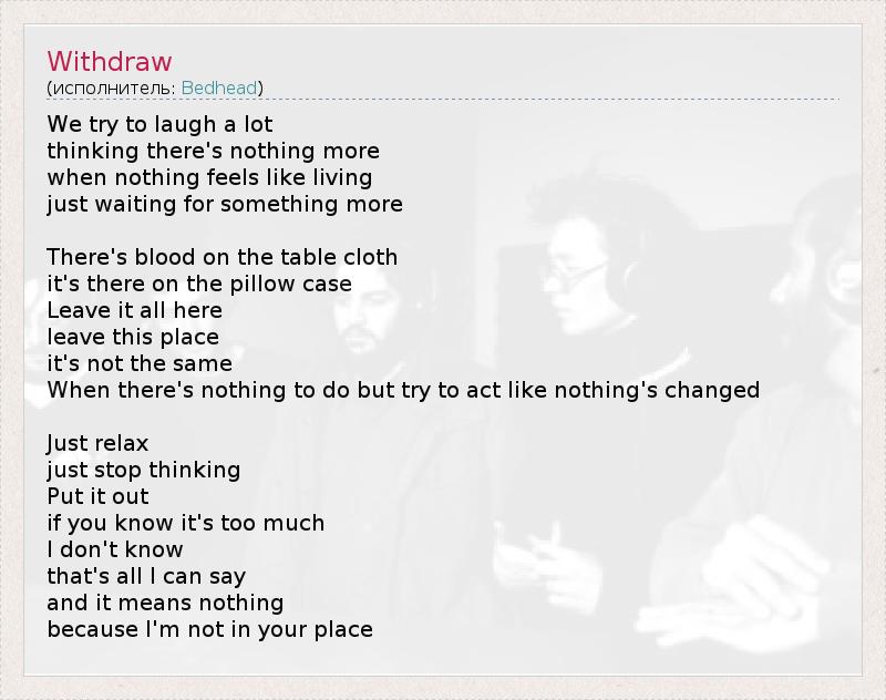 Это интересно:Когда-то давно, в промежутках между занятиями в школе Wichita Falls, штат Texas, две пары братьев Bubba и Matt Kadane и Joshua и Mischo McCay все вместе играли в своей первой группе. Когда коллектив распался, Кэдэйны переехали в Даллас и стали Bedhead, а МкКейсы переехали в Афины, Джорджия, и стали Macha. Однако, обе команды продолжали питать друг к другу нежные чувства.Bedhead совместили в своем творчестве музыкальные... продолжение