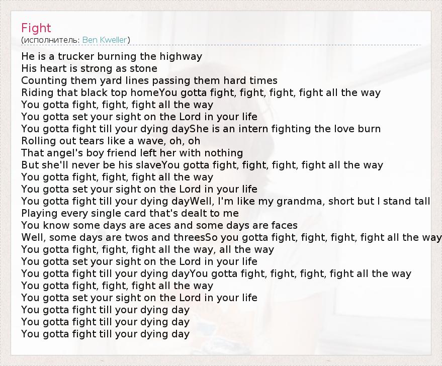 Well, some days are twos and threesSo you gotta fight, fight, fight, fight all the way