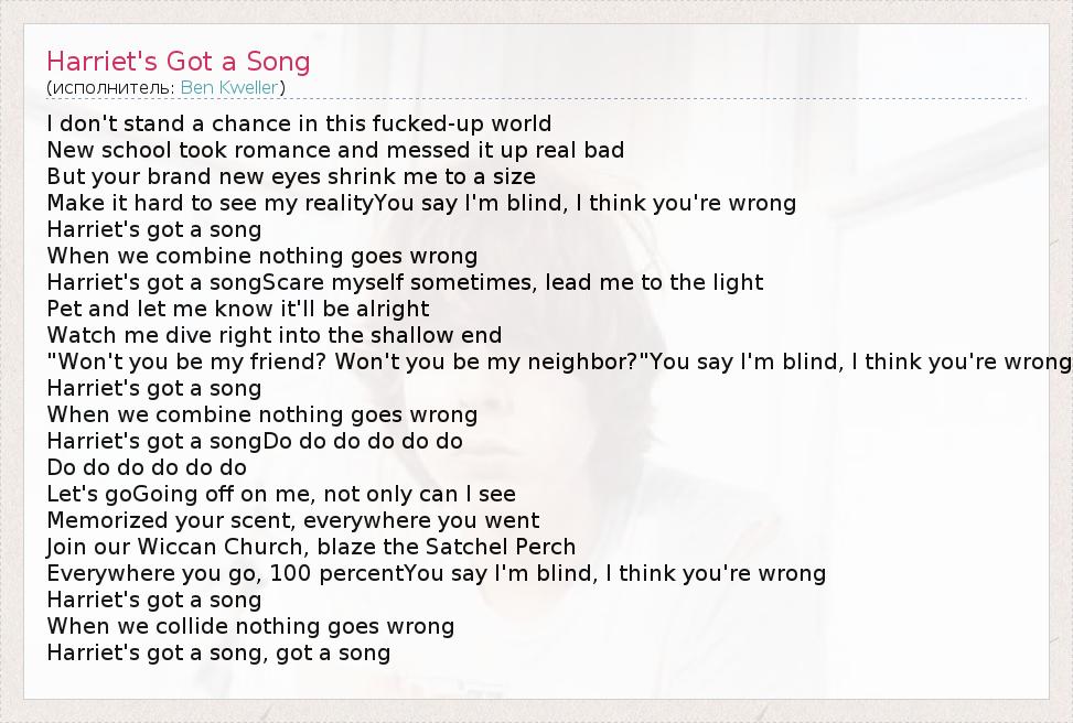 А как ты думаешь, о чем песня "Harriet's Got a Song" ?