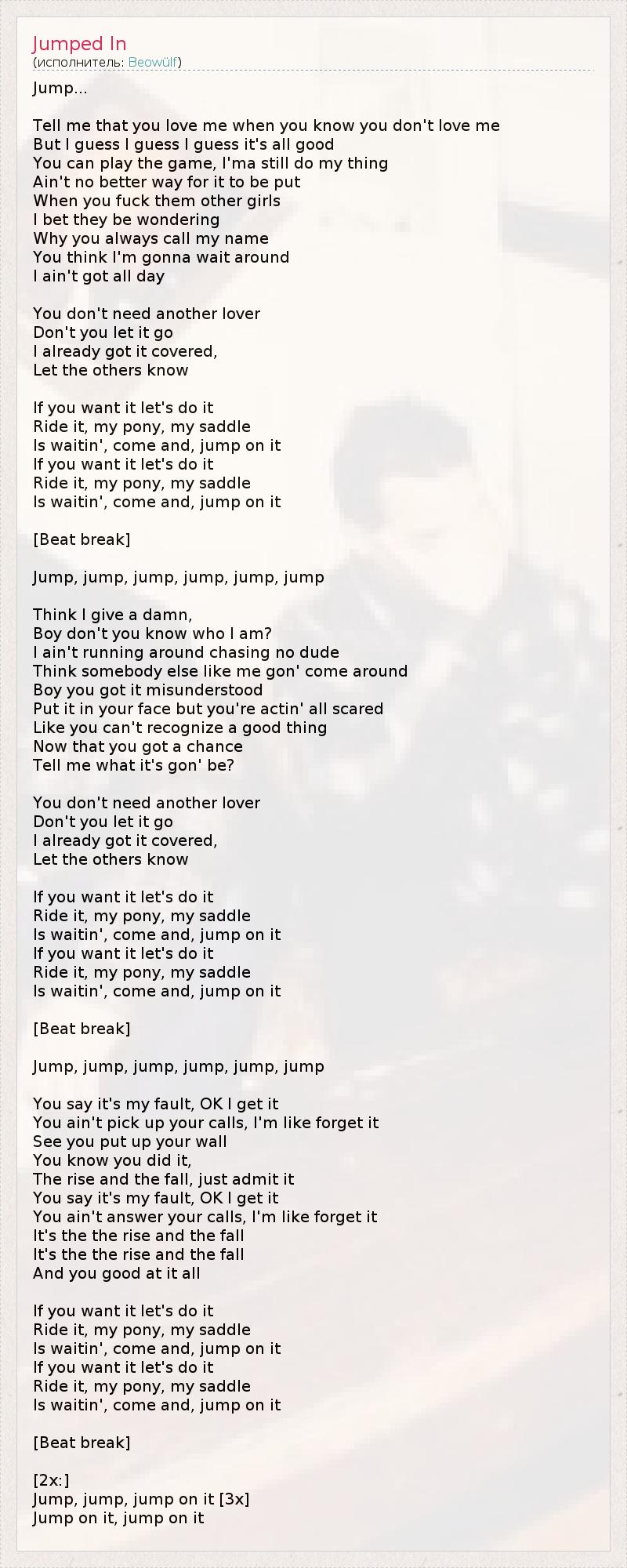 1 - pony - низкорослая лошадь, а также (в сленге) небольшой автомобиль. В песне Jump используется сампл из трека Ginuwine "Pony", а также текст припева, в оригинале исполненный мужчиной. Только первая строчка оригинала звучала более вызывающе: "If you're horny, let's do it" (= Если ты возбуждена, давай сделаем это) (прим. Nadine)