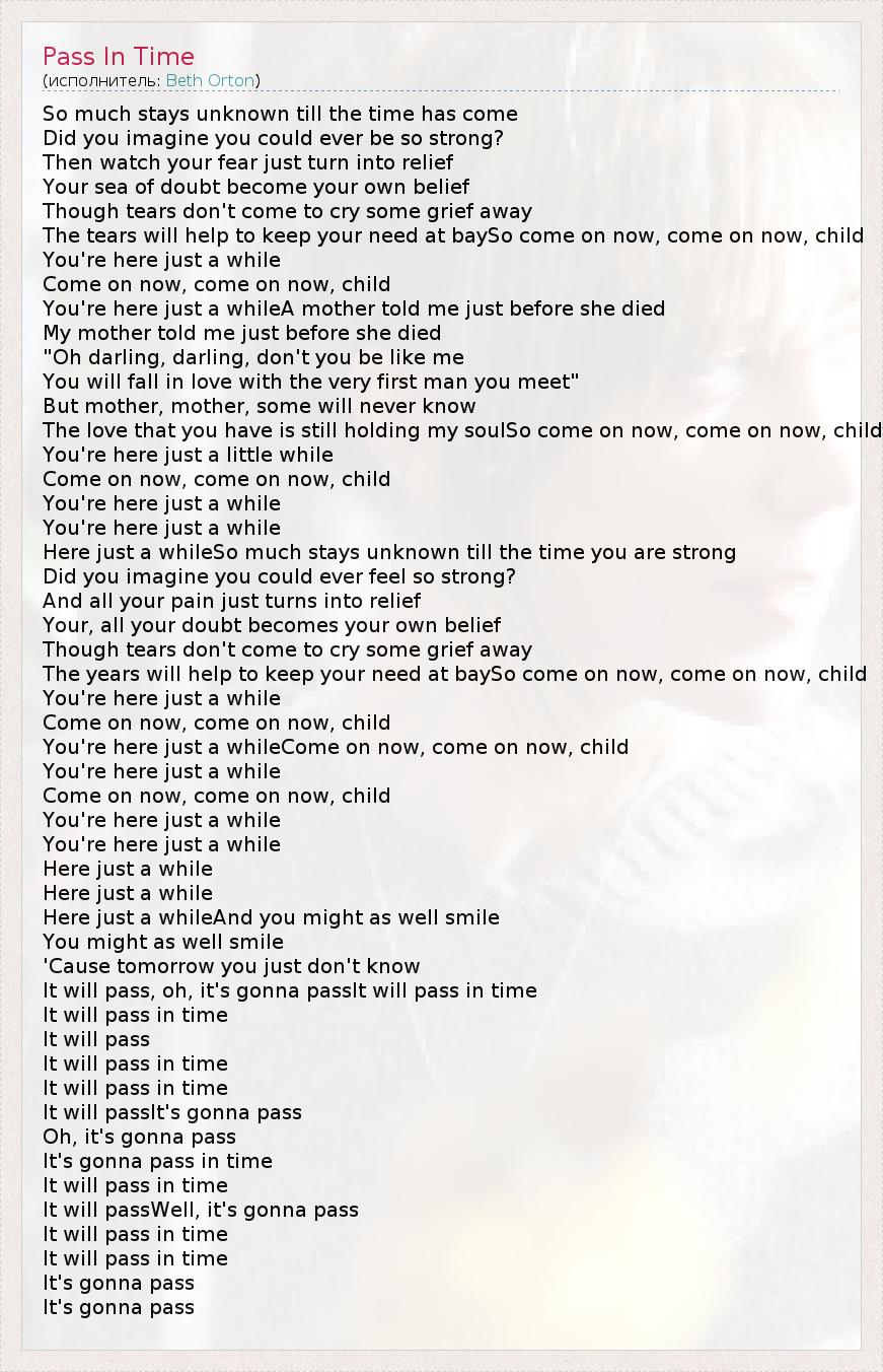 So much stays unknown till the time has come Did you imagine you could ever be so strong? Then watch your fear just turn into relief Your sea of doubt become your own belief Though tears don't come to cry some grief away The tears will help to keep your need at baySo come on now, come on now, child You're here just a while Come on now, come on now, child You're here just a whileA mother told me just before she died My mother told me just before she died "Oh darling, darling, don't you be like me You will fall in love with the very first man you meet" But mother, mother, some will never know The love that you have is still holding my soulSo come on now, come on now, child You're here just a little while Come on now, come on now, child You're here just a while You're here just a while Here just a whileSo much stays unknown till the time you are strong Did you imagine you could ever feel so strong? And all your pain just turns into relief Your, all your doubt becomes your own belief Though tears don't come to cry some grief away The years will help to keep your need at baySo come on now, come on now, child You're here just a while Come on now, come on now, child You're here just a whileCome on now, come on now, child You're here just a while Come on now, come on now, child You're here just a while You're here just a while Here just a while Here just a while Here just a whileAnd you might as well smile You might as well smile 'Cause tomorrow you just don't know It will pass, oh, it's gonna passIt will pass in time It will pass in time It will pass It will pass in time It will pass in time It will passIt's gonna pass Oh, it's gonna pass It's gonna pass in time It will pass in time It will passWell, it's gonna pass It will pass in time It will pass in time It's gonna pass It's gonna pass