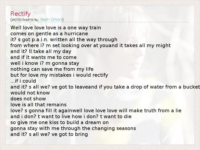 Well love love love is a one way train comes on gentle as a hurricane it? s got p.a.i.n. written all the way through from where i? m set looking over at youand it takes all my might and it? ll take all my day and if it wants me to come well i know i? m gonna stay nothing can save me from my life but for love my mistakes i would rectify ...if i could and it? s all we? ve got to leaveand if you take a drop of water from a bucket would not know does not show love is all that remains love? s gonna fill it againwell love love love will make truth from a lie and i don? t want to live how i don? t want to die so give me one kiss to build a dream on gonna stay with me through the changing seasons and it? s all we? ve got to bring