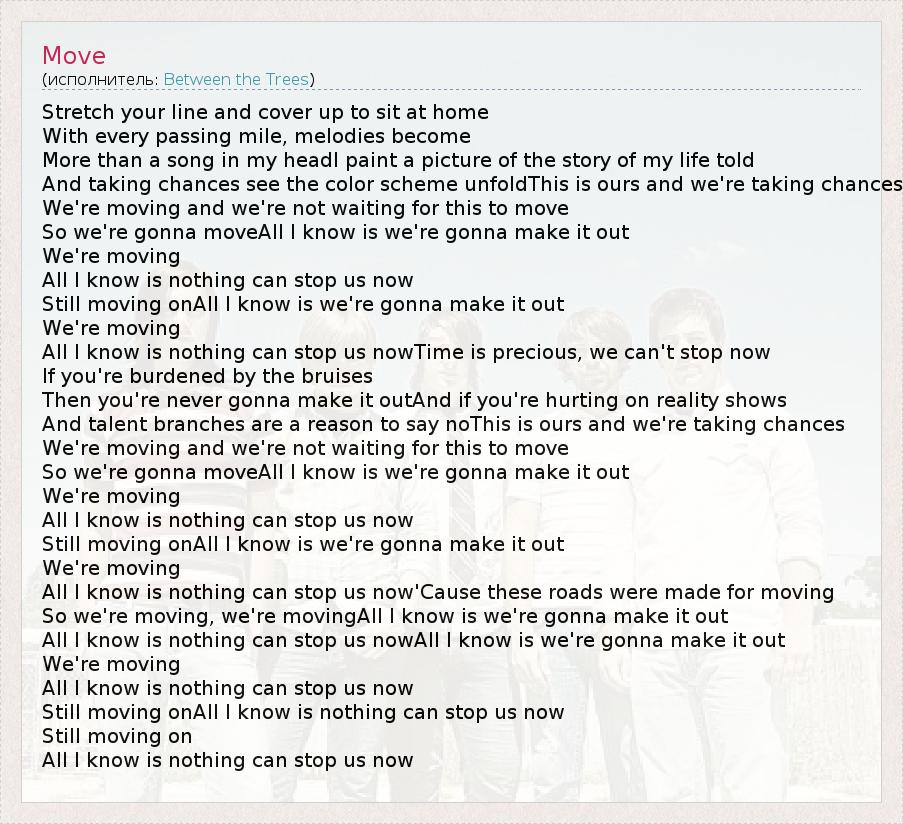 All I know is nothing can stop us now'Cause these roads were made for moving