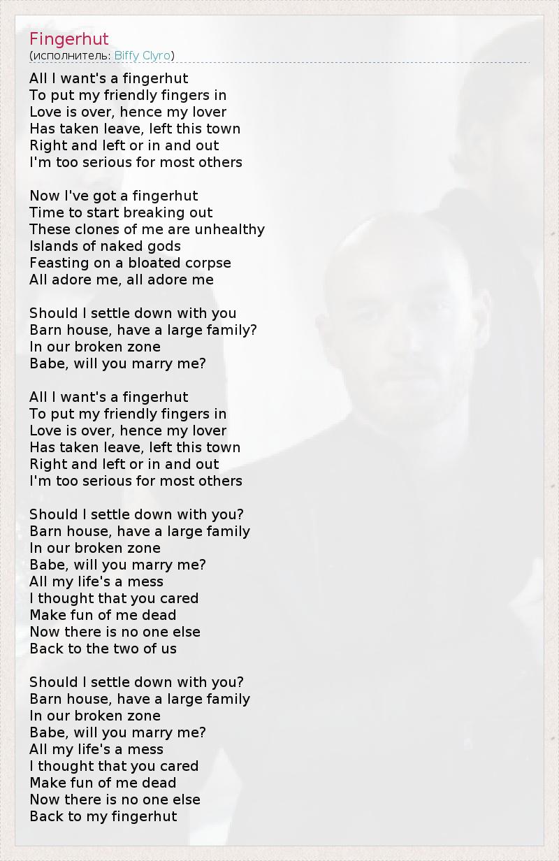 All I want's a fingerhut To put my friendly fingers in Love is over, hence my lover Has taken leave, left this town Right and left or in and out I'm too serious for most others Now I've got a fingerhut Time to start breaking out These clones of me are unhealthy Islands of naked gods Feasting on a bloated corpse All adore me, all adore me Should I settle down with you Barn house, have a large family? In our broken zone Babe, will you marry me? All I want's a fingerhut To put my friendly fingers in Love is over, hence my lover Has taken leave, left this town Right and left or in and out I'm too serious for most others Should I settle down with you? Barn house, have a large family In our broken zone Babe, will you marry me? All my life's a mess I thought that you cared Make fun of me dead Now there is no one else Back to the two of us Should I settle down with you? Barn house, have a large family In our broken zone Babe, will you marry me? All my life's a mess I thought that you cared Make fun of me dead Now there is no one else Back to my fingerhut
