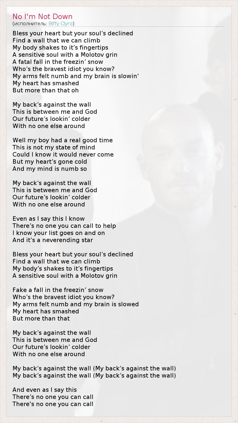 Bless your heart but your soul’s declined Find a wall that we can climb My body shakes to it’s fingertips A sensitive soul with a Molotov grin A fatal fall in the freezin’ snow Who’s the bravest idiot you know? My arms felt numb and my brain is slowin' My heart has smashed But more than that oh My back’s against the wall This is between me and God Our future’s lookin’ colder With no one else around Well my boy had a real good time This is not my state of mind Could I know it would never come But my heart’s gone cold And my mind is numb so My back’s against the wall This is between me and God Our future’s lookin’ colder With no one else around Even as I say this I know There’s no one you can call to help I know your list goes on and on And it’s a neverending star Bless your heart but your soul’s declined Find a wall that we can climb My body’s shakes to it’s fingertips A sensitive soul with a Molotov grin Fake a fall in the freezin’ snow Who’s the bravest idiot you know? My arms felt numb and my brain is slowed My heart has smashed But more than that My back’s against the wall This is between me and God Our future’s lookin’ colder With no one else around My back’s against the wall (My back’s against the wall) My back’s against the wall (My back’s against the wall) And even as I say this There’s no one you can call There's no one you can call