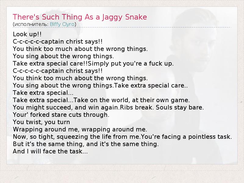 Look up!! C-c-c-c-c-captain christ says!! You think too much about the wrong things. You sing about the wrong things. Take extra special care!!Simply put you're a fuck up. C-c-c-c-c-captain christ says!! You think too much about the wrong things. You sing about the wrong things.Take extra special care.. Take extra special... Take extra special...Take on the world, at their own game. You might succeed, and win again.Ribs break. Souls stay bare. Your' forked stare cuts through. You twist, you turn Wrapping around me, wrapping around me. Now, so tight, squeezing the life from me.You're facing a pointless task. But it's the same thing, and it's the same thing. And I will face the task...