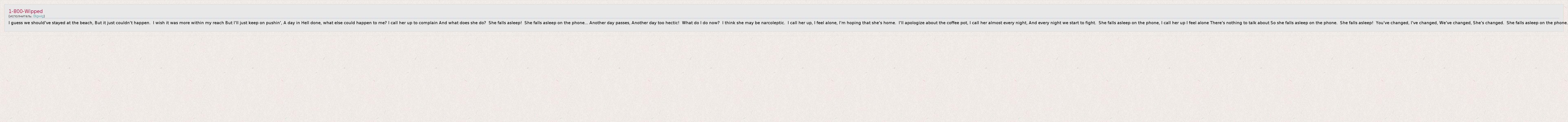 I guess we should've stayed at the beach, But it just couldn't happen.  I wish it was more within my reach But I'll just keep on pushin', A day in Hell done, what else could happen to me? I call her up to complain And what does she do?  She falls asleep!  She falls asleep on the phone... Another day passes, Another day too hectic!  What do I do now?  I think she may be narcoleptic.  I call her up, I feel alone, I'm hoping that she's home.  I'll apologize about the coffee pot, I call her almost every night, And every night we start to fight.  She falls asleep on the phone, I call her up I feel alone There's nothing to talk about So she falls asleep on the phone.  She falls asleep!  You've changed, I've changed, We've changed, She's changed.  She falls asleep on the phone.