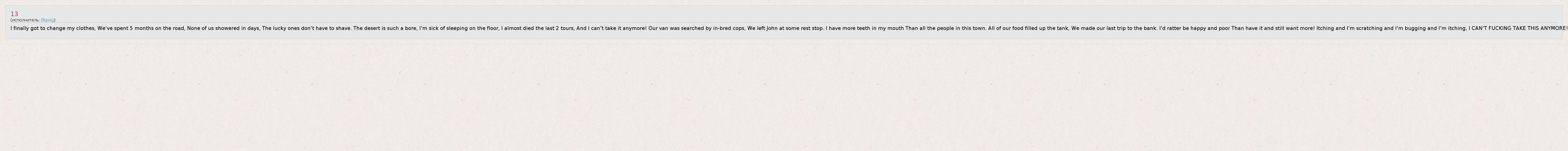 I finally got to change my clothes, We've spent 5 months on the road, None of us showered in days, The lucky ones don't have to shave. The desert is such a bore, I'm sick of sleeping on the floor, I almost died the last 2 tours, And I can't take it anymore! Our van was searched by in-bred cops, We left John at some rest stop. I have more teeth in my mouth Than all the people in this town. All of our food filled up the tank, We made our last trip to the bank. I'd ratter be happy and poor Than have it and still want more! Itching and I'm scratching and I'm bugging and I'm itching, I CAN'T FUCKING TAKE THIS ANYMORE!