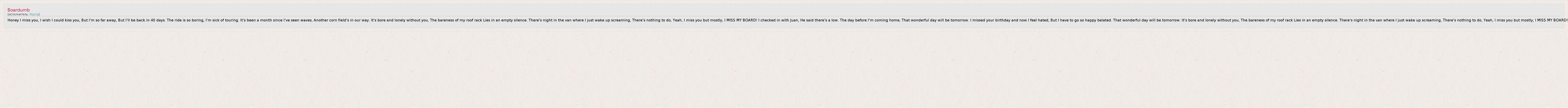 Honey I miss you, I wish I could kiss you, But I'm so far away, But I'll be back in 40 days. The ride is so boring, I'm sick of touring. It's been a month since I've seen waves, Another corn field's in our way. It's bore and lonely without you, The bareness of my roof rack Lies in an empty silence. There's night in the van where I just wake up screaming, There's nothing to do, Yeah, I miss you but mostly, I MISS MY BOARD! I checked in with Juan, He said there's a low. The day before I'm coming home, That wonderful day will be tomorrow. I missed your birthday and now I feel hated, But I have to go so happy belated. That wonderful day will be tomorrow. It's bore and lonely without you, The bareness of my roof rack Lies in an empty silence. There's night in the van where I just wake up screaming, There's nothing to do, Yeah, I miss you but mostly, I MISS MY BOARD!