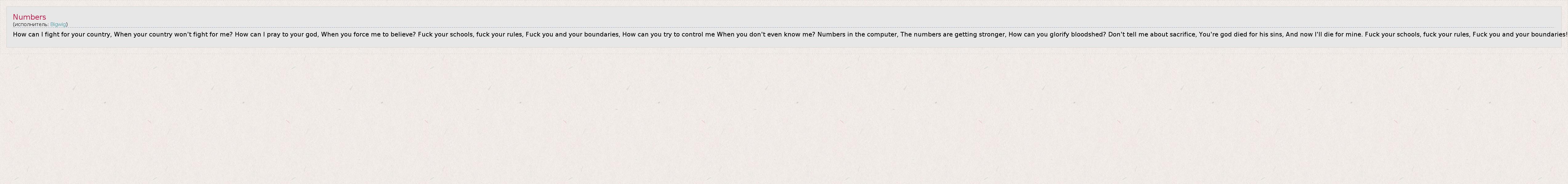 How can I fight for your country, When your country won't fight for me? How can I pray to your god, When you force me to believe? Fuck your schools, fuck your rules, Fuck you and your boundaries, How can you try to control me When you don't even know me? Numbers in the computer, The numbers are getting stronger, How can you glorify bloodshed? Don't tell me about sacrifice, You're god died for his sins, And now I'll die for mine. Fuck your schools, fuck your rules, Fuck you and your boundaries!