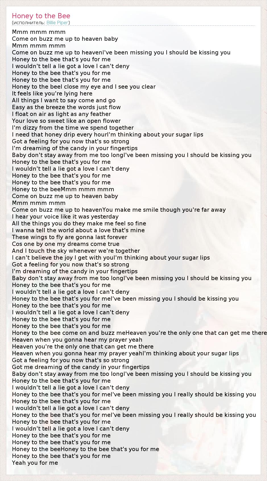 Mmm mmm mmm Come on buzz me up to heaven baby Mmm mmm mmm Come on buzz me up to heavenI've been missing you I should be kissing you Honey to the bee that's you for me I wouldn't tell a lie got a love I can't deny Honey to the bee that's you for me Honey to the bee that's you for me Honey to the beeI close my eye and I see you clear It feels like you're lying here All things I want to say come and go Easy as the breeze the words just flow I float on air as light as any feather Your love so sweet like an open flower I'm dizzy from the time we spend together I need that honey drip every hourI'm thinking about your sugar lips Got a feeling for you now that's so strong I'm dreaming of the candy in your fingertips Baby don't stay away from me too longI've been missing you I should be kissing you Honey to the bee that's you for me I wouldn't tell a lie got a love I can't deny Honey to the bee that's you for me Honey to the bee that's you for me Honey to the beeMmm mmm mmm Come on buzz me up to heaven baby Mmm mmm mmm Come on buzz me up to heavenYou make me smile though you're far away I hear your voice like it was yesterday All the things you do they make me feel so fine I wanna tell the world about a love that's mine These wings to fly are gonna last forever Cos one by one my dreams come true And I touch the sky whenever we're together I can't believe the joy I get with youI'm thinking about your sugar lips Got a feeling for you now that's so strong I'm dreaming of the candy in your fingertips Baby don't stay away from me too longI've been missing you I should be kissing you Honey to the bee that's you for me I wouldn't tell a lie got a love I can't deny Honey to the bee that's you for meI've been missing you I should be kissing you Honey to the bee that's you for me I wouldn't tell a lie got a love I can't deny Honey to the bee that's you for me Honey to the bee that's you for me Honey to the bee come on and buzz meHeaven you're the only one that can get me there Heaven when you gonna hear my prayer yeah Heaven you're the only one that can get me there Heaven when you gonna hear my prayer yeahI'm thinking about your sugar lips Got a feeling for you now that's so strong Got me dreaming of the candy in your fingertips Baby don't stay away from me too longI've been missing you I should be kissing you Honey to the bee that's you for me I wouldn't tell a lie got a love I can't deny Honey to the bee that's you for meI've been missing you I really should be kissing you Honey to the bee that's you for me I wouldn't tell a lie got a love I can't deny Honey to the bee that's you for meI've been missing you I really should be kissing you Honey to the bee that's you for me I wouldn't tell a lie got a love I can't deny Honey to the bee that's you for me Honey to the bee that's you for me Honey to the beeHoney to the bee that's you for me Honey to the bee that's you for me Yeah you for me