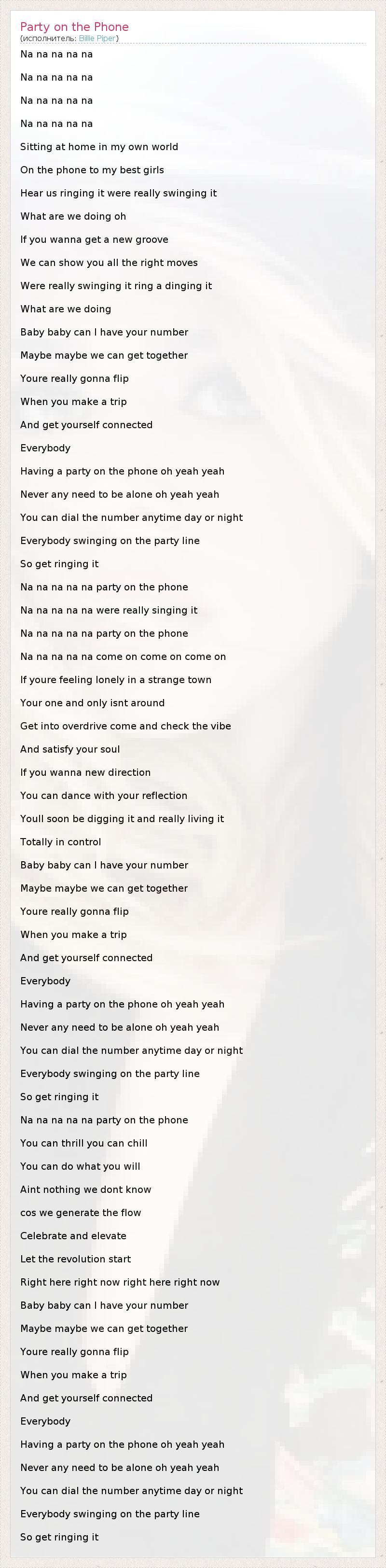 Na na na na na Na na na na na Na na na na na Na na na na na Sitting at home in my own world On the phone to my best girls Hear us ringing it were really swinging it What are we doing oh If you wanna get a new groove We can show you all the right moves Were really swinging it ring a dinging it What are we doing Baby baby can I have your number Maybe maybe we can get together Youre really gonna flip When you make a trip And get yourself connected Everybody Having a party on the phone oh yeah yeah Never any need to be alone oh yeah yeah You can dial the number anytime day or night Everybody swinging on the party line So get ringing it Na na na na na party on the phone Na na na na na were really singing it Na na na na na party on the phone Na na na na na come on come on come on If youre feeling lonely in a strange town Your one and only isnt around Get into overdrive come and check the vibe And satisfy your soul If you wanna new direction You can dance with your reflection Youll soon be digging it and really living it Totally in control Baby baby can I have your number Maybe maybe we can get together Youre really gonna flip When you make a trip And get yourself connected Everybody Having a party on the phone oh yeah yeah Never any need to be alone oh yeah yeah You can dial the number anytime day or night Everybody swinging on the party line So get ringing it Na na na na na party on the phone You can thrill you can chill You can do what you will Aint nothing we dont know cos we generate the flow Celebrate and elevate Let the revolution start Right here right now right here right now Baby baby can I have your number Maybe maybe we can get together Youre really gonna flip When you make a trip And get yourself connected Everybody Having a party on the phone oh yeah yeah Never any need to be alone oh yeah yeah You can dial the number anytime day or night Everybody swinging on the party line So get ringing it