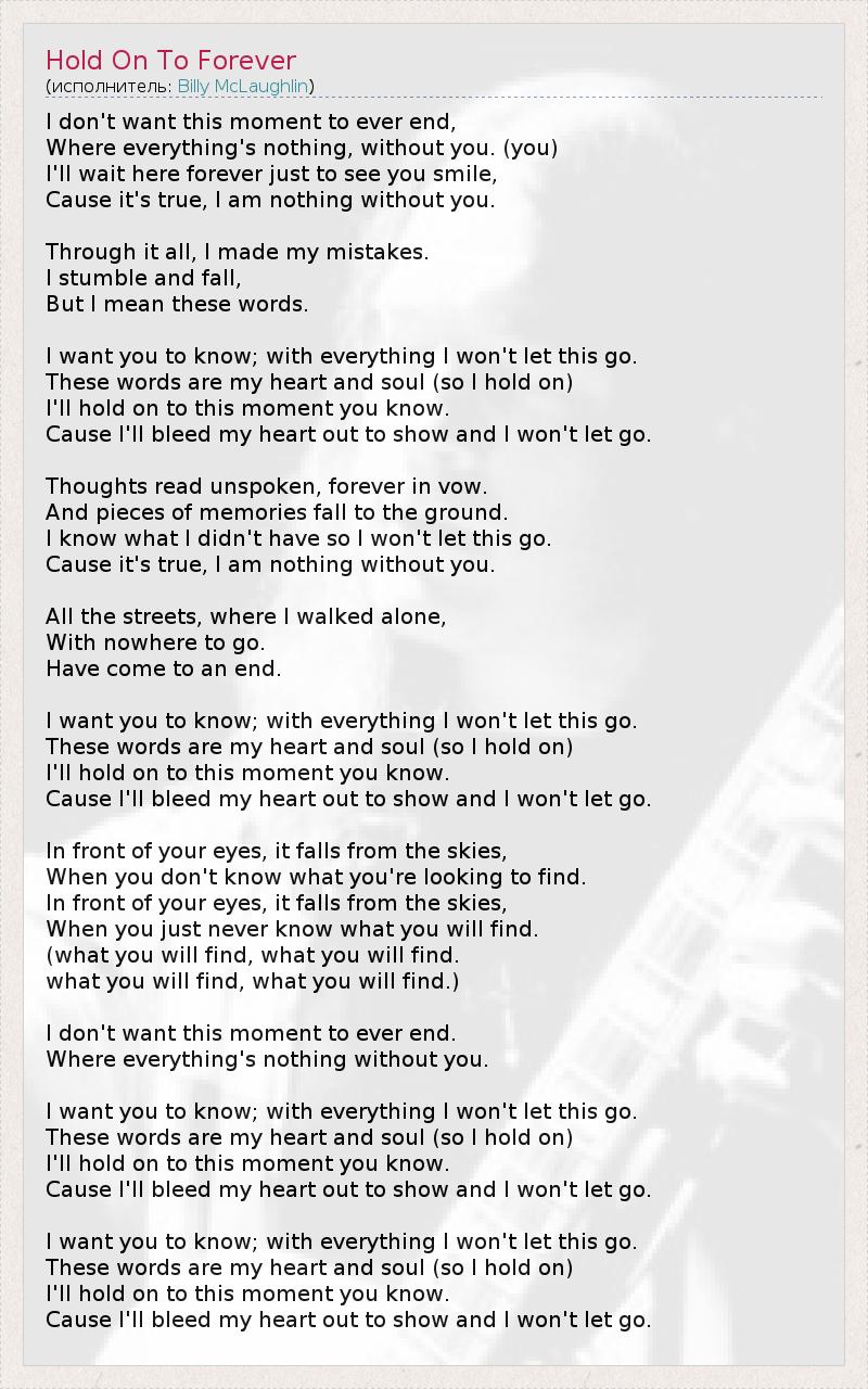 Я не хочу, чтобы этот миг закончился, Где без тебя всё – это ничто. Я буду ждать вечность, чтоб увидеть твою улыбку, Потому что это правда, я ничто без тебя. Несмотря ни на что, я совершаю ошибки, Я спотыкаюсь и падаю, Но я говорю правду. Я хочу, чтобы ты знала, я не отпущу тебя ни за что – Это не пустые слова - слова от сердца. Я буду держаться за этот миг, ты ведь знаешь. Я умру за то, чтобы доказать, что не отпущу тебя. Чтение невысказанных мыслей, клятвы в вечном, Обрывки воспоминаний – и те теряются… Я знаю, чего у меня не было и поэтому не отпущу, Это правда, я ничто без тебя. Улицы, по которым я шел в одиночестве, Вели в никуда, Но я дошёл до конца... Я хочу, чтобы ты знала, я не отпущу тебя ни за что – Это не пустые слова - слова от сердца. Я буду держаться за этот миг, ты ведь знаешь. Я умру за то, чтобы доказать, что не отпущу тебя. Когда ты не знаешь, что именно ищешь, Это что-то сваливается на тебя с небес. Когда ты не знаешь, что найдешь, Это что-то сваливается на тебя с небес. (что ты найдёшь, что ты найдёшь что ты найдёшь, что ты найдёшь) Я не хочу, чтобы этот миг закончился, Ведь без тебя всё – это ничто. Я хочу, чтобы ты знала, я не отпущу тебя ни за что – Это не пустые слова - слова от сердца. Я буду держаться за этот миг, ты ведь знаешь. Я умру за то, чтобы доказать, что не отпущу тебя. Я хочу, чтобы ты знала, я не отпущу тебя ни за что – Это не пустые слова - слова от сердца. Я буду держаться за этот миг, ты ведь знаешь. Я умру за то, чтобы доказать, что не отпущу тебя.