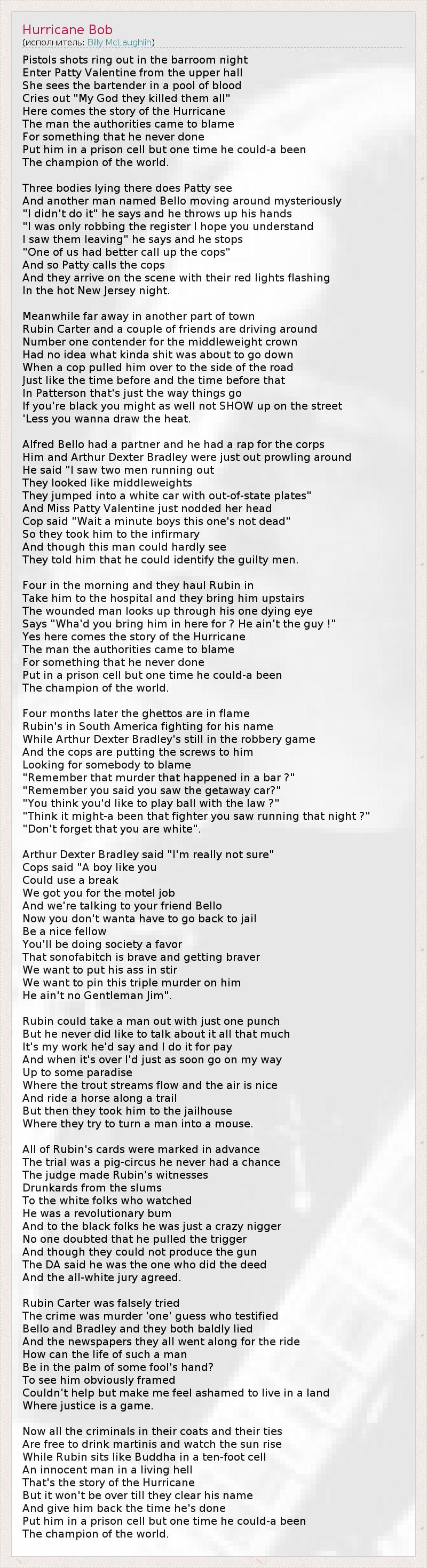 *"Ураган" - прозвище знаменитого чернокожего боксёра Рубина Картера. Песня является знаком протеста против расизма и бесчестных судей.