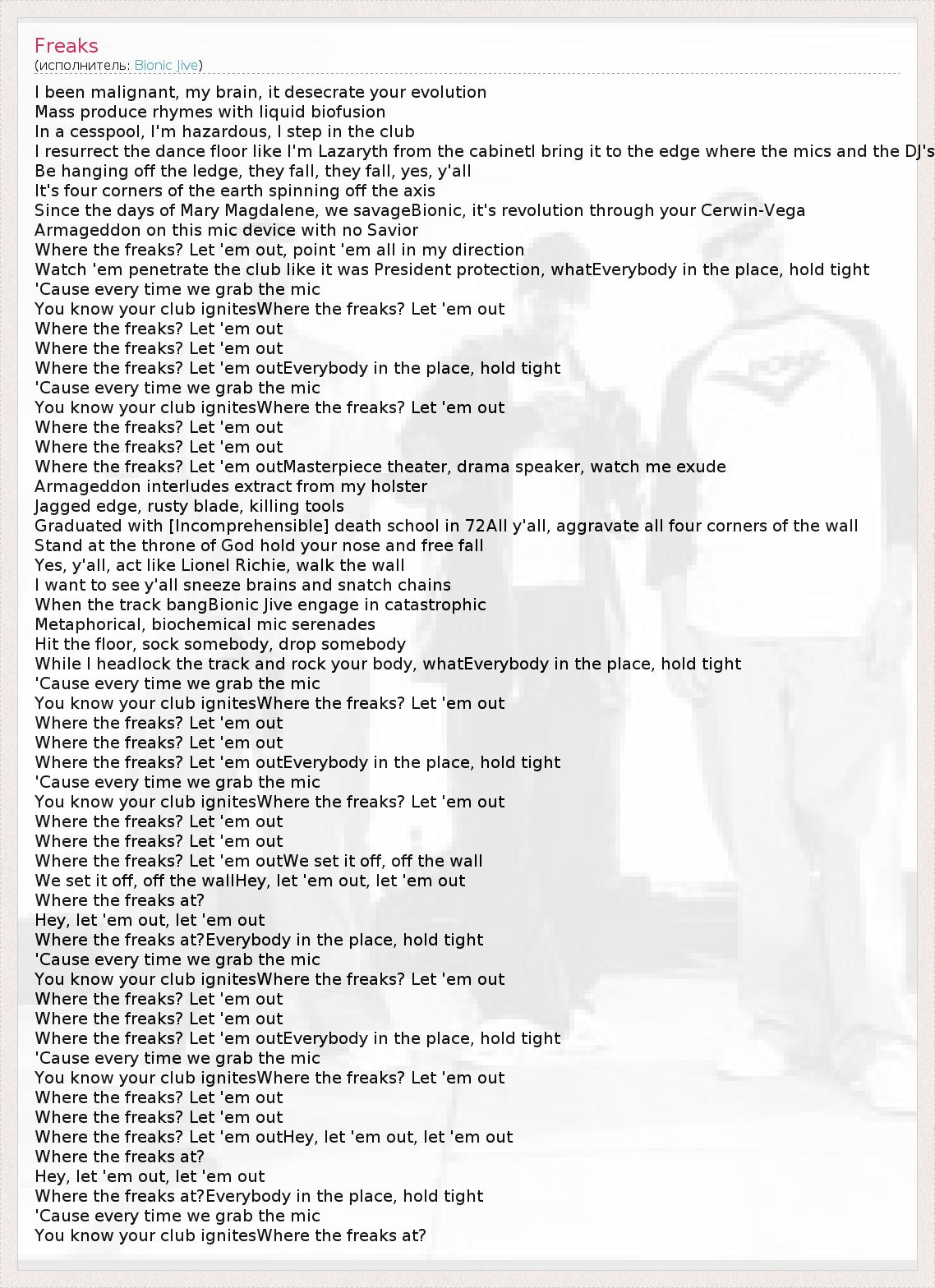 Это интересно:Bionic Jive - это американская Rapcore-группа из города Феникс, штат Аризона, основанная в начале 1998 года. McGregor и Elyea пригласили Гартнера (Gartner) и Роббинса (Robbins), вокалиста Деррика Барроуса (Derrick Burrows) и мультиинструменталиста Криса Элснора (Chris Elsnor aka TG1). Первоначально играя фанк-метал, группа выступала в окрестностях Феникса до распада сразу же после выхода их независимого дебютного... продолжение