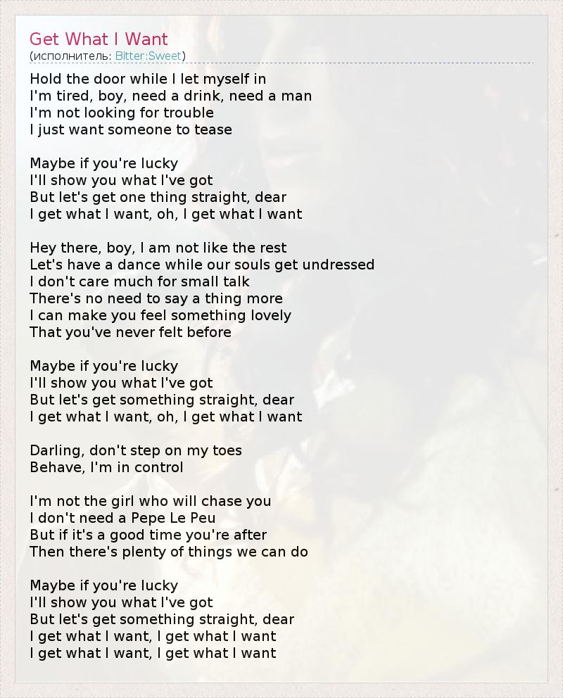 Придержи-ка дверь, пока я шагаю внутрь. Я устала, парень, мне нужен алкоголь, мне нужен мужчина. Я не ищу приключений, Я только хочу кого-нибудь подразнить. Может, если тебе повезёт, Я открою тебе свои карты, Но давай кое-что проясним, милый: Я получу что хочу, о, получу что хочу. Эй, малыш, я не такая как остальные, Давай потанцуем, пока наши души обнажаются. Я не охотник до светской болтовни, Нет нужды говорить что-то ещё. Я могу подарить тебе чудесное чувство, Нечто, чего ты никогда не испытывал прежде. Может, если тебе повезёт, Я открою тебе свои карты, Но давай кое-что проясним, милый: Я получу что хочу, о, получу что хочу. Дорогой, не оттопчи мне пальчики. Веди себя как следует, я всё держу под контролем. Я не та девушка, что будет тебя преследовать. Мне не нужен Пепе ле Пю. 1 Но если ты хочешь славно повеселиться, Мы найдём себе массу занятий. Может, если тебе повезёт, Я открою тебе свои карты, Но давай кое-что проясним, милый: Я получу что хочу, я получу что хочу. Я получу что хочу, я получу что хочу. 1 – Персонаж мультфильмов студии Уорнер Бразерс (серии Looney Tunes and Merrie Melodies) – любвеобильный скунс-француз.