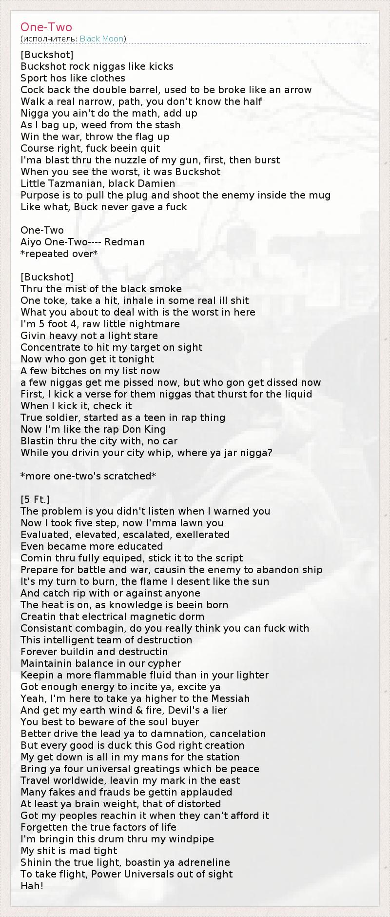 [Buckshot] Buckshot rock niggas like kicks Sport hos like clothes Cock back the double barrel, used to be broke like an arrow Walk a real narrow, path, you don't know the half Nigga you ain't do the math, add up As I bag up, weed from the stash Win the war, throw the flag up Course right, fuck beein quit I'ma blast thru the nuzzle of my gun, first, then burst When you see the worst, it was Buckshot Little Tazmanian, black Damien Purpose is to pull the plug and shoot the enemy inside the mug Like what, Buck never gave a fuck One-Two Aiyo One-Two---- Redman *repeated over* [Buckshot] Thru the mist of the black smoke One toke, take a hit, inhale in some real ill shit What you about to deal with is the worst in here I'm 5 foot 4, raw little nightmare Givin heavy not a light stare Concentrate to hit my target on sight Now who gon get it tonight A few bitches on my list now a few niggas get me pissed now, but who gon get dissed now First, I kick a verse for them niggas that thurst for the liquid When I kick it, check it True soldier, started as a teen in rap thing Now I'm like the rap Don King Blastin thru the city with, no car While you drivin your city whip, where ya jar nigga? *more one-two's scratched* [5 Ft.] The problem is you didn't listen when I warned you Now I took five step, now I'mma lawn you Evaluated, elevated, escalated, exellerated Even became more educated Comin thru fully equiped, stick it to the script Prepare for battle and war, causin the enemy to abandon ship It's my turn to burn, the flame I desent like the sun And catch rip with or against anyone The heat is on, as knowledge is beein born Creatin that electrical magnetic dorm Consistant combagin, do you really think you can fuck with This intelligent team of destruction Forever buildin and destructin Maintainin balance in our cypher Keepin a more flammable fluid than in your lighter Got enough energy to incite ya, excite ya Yeah, I'm here to take ya higher to the Messiah And get my earth wind & fire, Devil's a lier You best to beware of the soul buyer Better drive the lead ya to damnation, cancelation But every good is duck this God right creation My get down is all in my mans for the station Bring ya four universal greatings which be peace Travel worldwide, leavin my mark in the east Many fakes and frauds be gettin applauded At least ya brain weight, that of distorted Got my peoples reachin it when they can't afford it Forgetten the true factors of life I'm bringin this drum thru my windpipe My shit is mad tight Shinin the true light, boastin ya adreneline To take flight, Power Universals out of sight Hah!