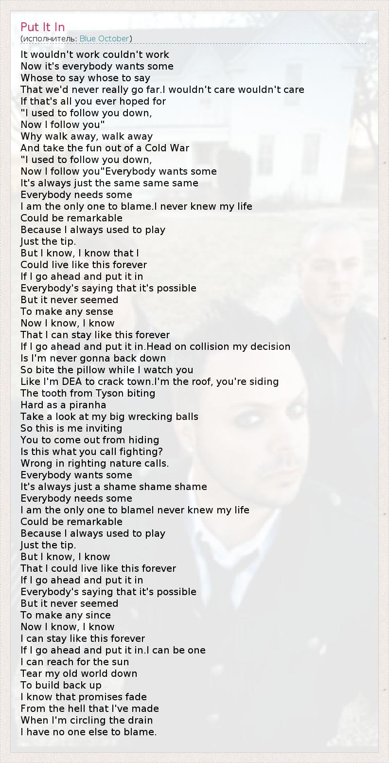 It wouldn't work couldn't work Now it's everybody wants some Whose to say whose to say That we'd never really go far.I wouldn't care wouldn't care If that's all you ever hoped for "I used to follow you down, Now I follow you" Why walk away, walk away And take the fun out of a Cold War "I used to follow you down, Now I follow you"Everybody wants some It's always just the same same same Everybody needs some I am the only one to blame.I never knew my life Could be remarkable Because I always used to play Just the tip. But I know, I know that I Could live like this forever If I go ahead and put it in Everybody's saying that it's possible But it never seemed To make any sense Now I know, I know That I can stay like this forever If I go ahead and put it in.Head on collision my decision Is I'm never gonna back down So bite the pillow while I watch you Like I'm DEA to crack town.I'm the roof, you're siding The tooth from Tyson biting Hard as a piranha Take a look at my big wrecking balls So this is me inviting You to come out from hiding Is this what you call fighting? Wrong in righting nature calls. Everybody wants some It's always just a shame shame shame Everybody needs some I am the only one to blameI never knew my life Could be remarkable Because I always used to play Just the tip. But I know, I know That I could live like this forever If I go ahead and put it in Everybody's saying that it's possible But it never seemed To make any since Now I know, I know I can stay like this forever If I go ahead and put it in.I can be one I can reach for the sun Tear my old world down To build back up I know that promises fade From the hell that I've made When I'm circling the drain I have no one else to blame.