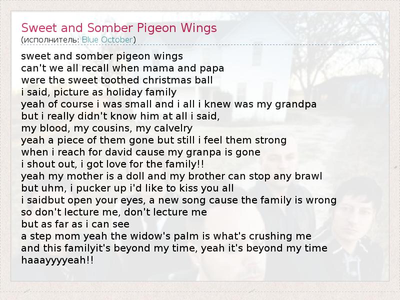 sweet and somber pigeon wings can't we all recall when mama and papa were the sweet toothed christmas ball i said, picture as holiday family yeah of course i was small and i all i knew was my grandpa but i really didn't know him at all i said, my blood, my cousins, my calvelry yeah a piece of them gone but still i feel them strong when i reach for david cause my granpa is gone i shout out, i got love for the family!! yeah my mother is a doll and my brother can stop any brawl but uhm, i pucker up i'd like to kiss you all i saidbut open your eyes, a new song cause the family is wrong so don't lecture me, don't lecture me but as far as i can see a step mom yeah the widow's palm is what's crushing me and this familyit's beyond my time, yeah it's beyond my time haaayyyyeah!!