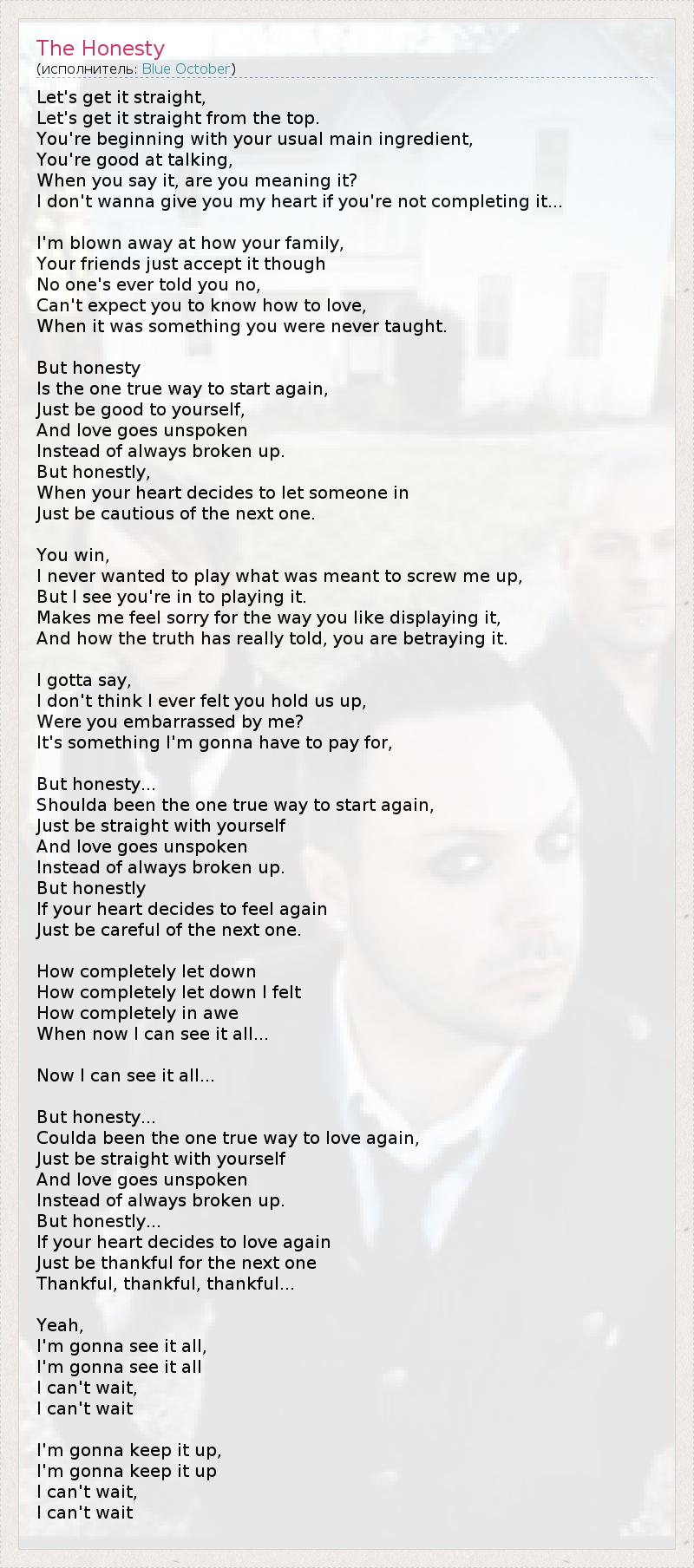 Давай разберемся, Давай проясним все с самого начала. Ты начинаешь со своего фирменного способа. Да, у тебя неплохо подвешен язык, Но когда ты говоришь, веришь ли ты в свои слова? Я не собираюсь дарить тебе свое сердце, раз ты не его половинка. Я поражаюсь на то, как твоя семья И твои друзья просто принимают все как есть, Тебе ведь никто никогда не отказывал. Так как же можно ожидать от тебя любви, Если тебя никто не учил любить? Но честность - Единственный верный способ начать все сначала. Просто будь добра сама к себе, И любовь останется внутри, Вместо того чтобы разбиться. Но, честно говоря, Когда твое сердце решит кого-то впустить, Будь осторожна. Ты победила. Зачем мне играть в то, что должно причинить мне боль? Но ты-то, похоже, согласна играть, И мне так жаль тебя, особенно когда ты это выставляешь напоказ, И, сказав правду, предаешь ее. Я должен сказать - Мне кажется, ты особенно никогда не поддерживала наш союз, Может, ты стыдишься меня? И мне придется заплатить за это. Но честность - Должна быть единственным способом начать сначала, Просто будь честной сама с собой, И любовь останется внутри, А не разрушится. Но, честно говоря, Если твое сердце вновь решит отдаться чувствам, Просто будь осторожна в следующий раз. Каким же разочарованным, Каким же разочарованным я себя чувствовал, Как же я трепетал! Теперь-то я вижу... Теперь-то я вижу... Но честность - Может быть единственным способом вновь полюбить. Просто будь честна сама с собой, И любовь останется внутри, А не разрушится. Но, честно говоря, Если твое сердце снова полюбит, Просто будь благодарна в следующий раз, Благодарна, благодарна, благодарна... Да, А я посмотрю, Я посмотрю, Не могу дождаться, Не могу дождаться. Я буду держаться, Я буду держаться Не могу дождаться. Не могу дождаться.