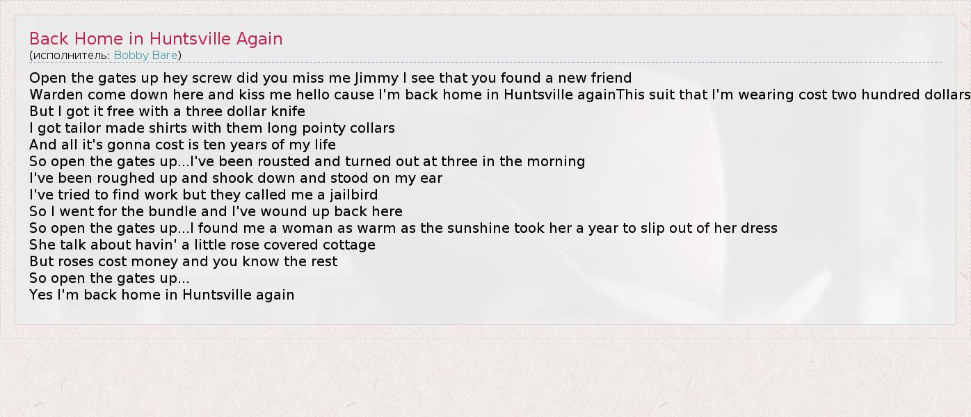 А как ты думаешь, о чем песня "Back Home in Huntsville Again" ?
