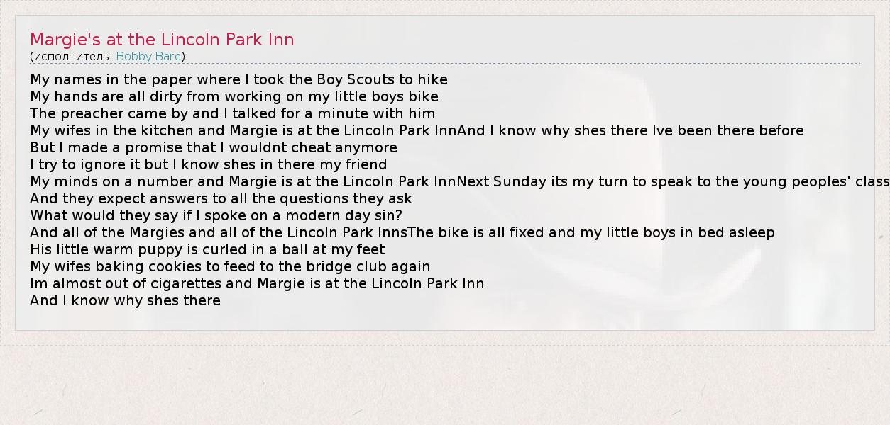 ГлавнаяИсполнителиBobby BareMargie's at the Lincoln Park Inn