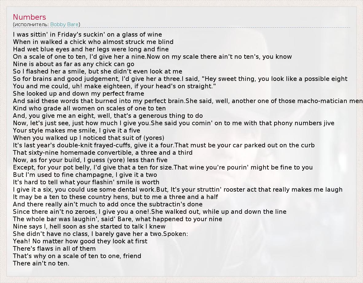 On a scale of one to ten, I'd give her a nine.Now on my scale there ain't no ten's, you know