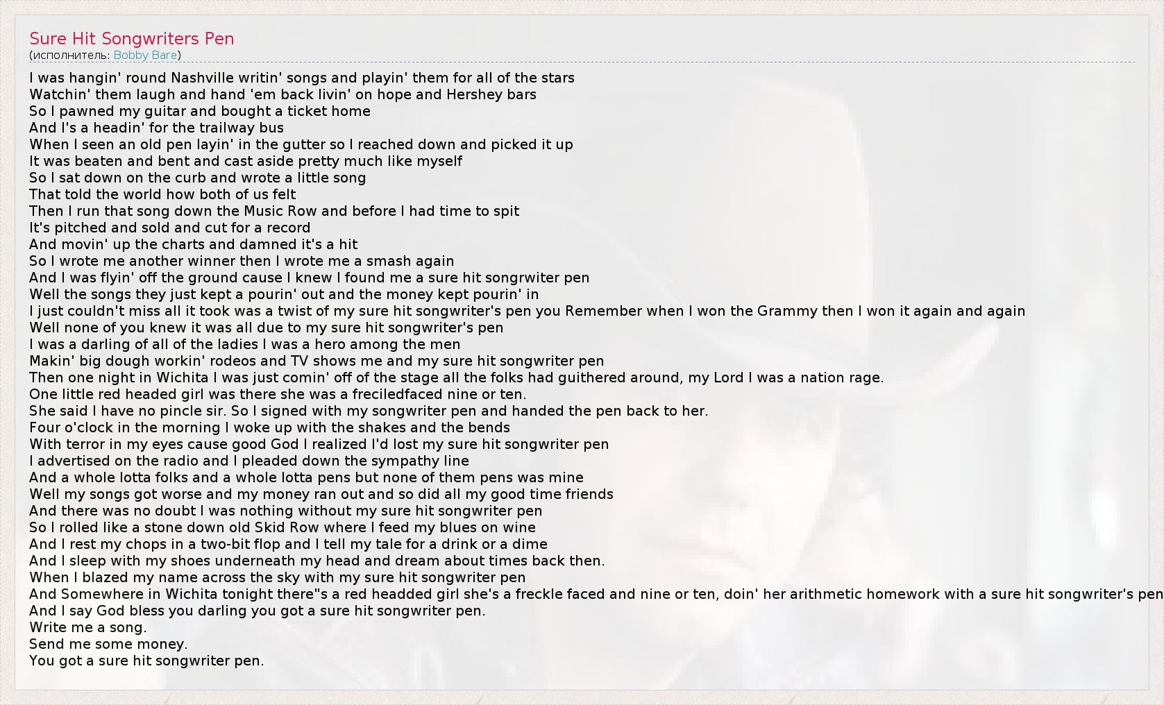 ГлавнаяИсполнителиBobby BareSure Hit Songwriters Pen