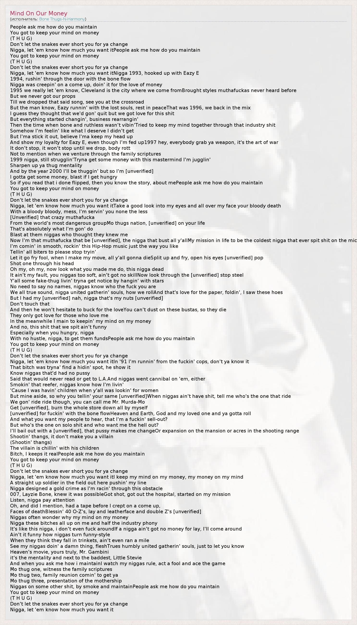 People ask me how do you maintain You got to keep your mind on money (T H U G) Don't let the snakes ever short you for ya change Nigga, let 'em know how much you want itPeople ask me how do you maintain You got to keep your mind on money (T H U G) Don't let the snakes ever short you for ya change Nigga, let 'em know how much you want itNigga 1993, hooked up with Eazy E 1994, rushin' through the door with the bone flow Nigga was creepin' on a come up, doin' it for the love of money 1995 we really let 'em know, Cleveland is the city where we come fromBrought styles muthafuckas never heard before But we never got our props Till we dropped that said song, see you at the crossroad But the man know, Eazy runnin' with the lost souls, rest in peaceThat was 1996, we back in the mix I guess they thought that we'd gon' quit but we got love for this shit But everything started changin', business rearrangin' Then the time when bone and ruthless wasn't vibin'Tried to keep my mind together through that industry shit Somehow I'm feelin' like what I deserve I didn't get But I'ma stick it out, believe I'ma keep my head up And show my loyalty for Eazy E, even though I'm fed up1997 hey, everybody grab ya weapon, it's the art of war It don't stop, it won't stop until we drop, body rott Not to mention when we venture through the family scriptures 1999 nigga, still strugglin'Tryna get some money with this mastermind I'm jugglin' Sharpen up ya thug mentality And by the year 2000 I'll be thuggin' but so I'm [unverified] I gotta get some money, blast if I get hungry So if you read that i done flipped, then you know the story, about mePeople ask me how do you maintain You got to keep your mind on money (T H U G) Don't let the snakes ever short you for ya change Nigga, let 'em know how much you want itTake a good look into my eyes and all over my face your bloody death With a bloody bloody, mess, I'm servin' you none the less [Unverified] that crazy muthafucka From the world's most dangerous groupMo thugs nation, [unverified] on your life That's absolutely what I'm gon' do Blast at them niggas who thought they knew me Now I'm that muthafucka that be [unverified], the nigga that bust all y'allMy mission in life to be the coldest nigga that ever spit shit on the mic I'm comin' in smooth, rockin' this Hip-Hop music just the way you like Tellin' all biters to please stop tryin' Let it go fry fool, when I make my move, all y'all gonna dieSplit up and fry, open his eyes [unverified] pop Shot one through his head Oh my, oh my, now look what you made me do, this nigga dead It ain't my fault, you niggas too soft, ain't got no skillNow look through the [unverified] stop steel Y'all some fake-thug livin' tryna get notice by hangin' with stars No need to say no names, niggas know who the fuck you are We all true sound, nigga united gatherin' souls, how we rollAnd that's love for the paper, foldin', I saw these hoes But I had my [unverified] nah, nigga that's my nuts [unverified] Don't touch that And then he won't hesitate to buck for the loveYou can't dust on these bustas, so they die They only got love for those who love me In the meanwhile I main to keepin' my mind on my money And no, this shit that we spit ain't funny Especially when you hungry, nigga With no hustle, nigga, to get them fundsPeople ask me how do you maintain You got to keep your mind on money (T H U G) Don't let the snakes ever short you for ya change Nigga, let 'em know how much you want itIn '91 I'm runnin' from the fuckin' cops, don't ya know it That bitch was tryna' find a hidin' spot, he show it Know niggas that'd had no pussy Said that would never read or get to L.A.And niggas went cannibal on 'em, either Smokin' that reefer, niggas know how I'm livin' 'Cause I was havin' children when y'all was lookin' for women But mine aside, so why you tellin' your same [unverified]When niggas ain't have shit, tell me who's the one that ride We gon' ride ride though, you can call me Mr. Murda-Mo Get [unverified], burn the whole store down all by myself [unverified] for fuckin' with the bone flowHeaven and Earth, God and my loved one and ya gotta roll And what you want my people to hear, that I'm a fuckin' sell-out? But who's the one on solo shit and who want me the hell out? I'll bail out with a [unverified], that pussy makes me changeOr expansion on the mansion or acres in the shooting range Shootin' thangs, it don't make you a villain (Shootin' thangs) The villain is chillin' with his children Bitch, I keeps it realPeople ask me how do you maintain You got to keep your mind on money (T H U G) Don't let the snakes ever short you for ya change Nigga, let 'em know how much you want itI keep my mind on my money, my money on my mind A straight up soldier in the field out here pushin' my line Nigga designed a gold crime as I'm racin' through this obstacle 007, Layzie Bone, knew it was possibleGot shot, got out the hospital, started on my mission Listen, nigga pay attention Oh, and did I mention, had a tape before I crept on a come up, Faces of deathBlessin' 40 O-Z's, lay and leatherface and double Z's [unverified] Niggas often wonder why my mind on my money Nigga these bitches all up on me and half the industry phony It's like this nigga, i don't even fuck aroundIf a nigga ain't got no money for lay, I'll come around Ain't it funny how niggas turn funny-style When they think they fall in trinkets, ain't even ran a mile See my niggas doin' a damn thing, fleshTrues humbly united gatherin' souls, just to let you know Heaven's movie, yours truly, Mr. Gambini it's the mentality and next to the baddest, Little Stevie And when you ask me how i maintainI watch my niggas rule, act a fool and ace the game Mo thug one, witness the family scriptures Mo thug two, family reunion comin' to get ya Mo thug three, presentation of the mothership Niggas on some other shit, by smoke and maintainPeople ask me how do you maintain You got to keep your mind on money (T H U G) Don't let the sna
