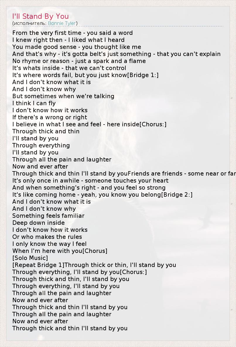 From the very first time - you said a word I knew right then - I liked what I heard You made good sense - you thought like me And that's why - it's gotta beIt's just something - that you can't explain No rhyme or reason - just a spark and a flame It's whats inside - that we can't control It's where words fail, but you just know[Bridge 1:] And I don't know what it is And I don't know why But sometimes when we're talking I think I can fly I don't know how it works If there's a wrong or right I believe in what I see and feel - here inside[Chorus:] Through thick and thin I'll stand by you Through everything I'll stand by you Through all the pain and laughter Now and ever after Through thick and thin I'll stand by youFriends are friends - some near or far It's only once in awhile - someone touches your heart And when something's right - and you feel so strong It's like coming home - yeah, you know you belong[Bridge 2:] And I don't know what it is And I don't know why Something feels familiar Deep down inside I don't know how it works Or who makes the rules I only know the way I feel When I'm here with you[Chorus] [Solo Music] [Repeat Bridge 1]Through thick or thin, I'll stand by you Through everything, I'll stand by you[Chorus:] Through thick and thin, I'll stand by you Through everything, I'll stand by you Through all the pain and laughter Now and ever after Through thick and thin I'll stand by you Through all the pain and laughter Now and ever after Through thick and thin I'll stand by you