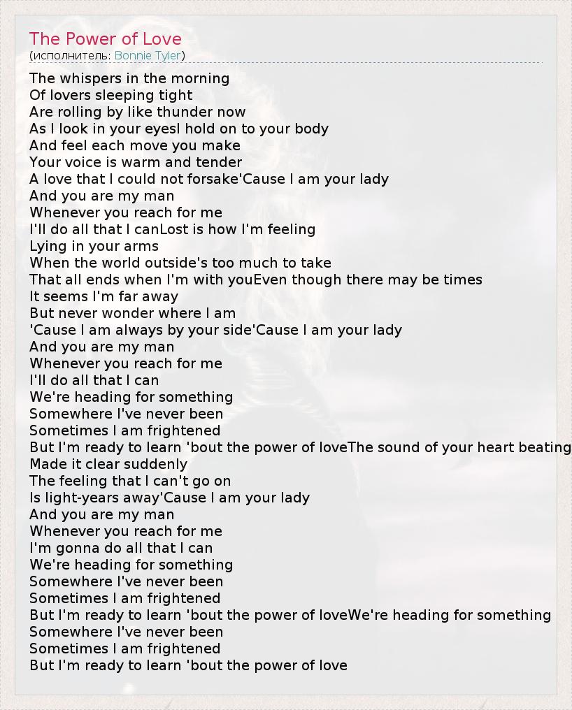 The whispers in the morning Of lovers sleeping tight Are rolling by like thunder now As I look in your eyesI hold on to your body And feel each move you make Your voice is warm and tender A love that I could not forsake'Cause I am your lady And you are my man Whenever you reach for me I'll do all that I canLost is how I'm feeling Lying in your arms When the world outside's too much to take That all ends when I'm with youEven though there may be times It seems I'm far away But never wonder where I am 'Cause I am always by your side'Cause I am your lady And you are my man Whenever you reach for me I'll do all that I can We're heading for something Somewhere I've never been Sometimes I am frightened But I'm ready to learn 'bout the power of loveThe sound of your heart beating Made it clear suddenly The feeling that I can't go on Is light-years away'Cause I am your lady And you are my man Whenever you reach for me I'm gonna do all that I can We're heading for something Somewhere I've never been Sometimes I am frightened But I'm ready to learn 'bout the power of loveWe're heading for something Somewhere I've never been Sometimes I am frightened But I'm ready to learn 'bout the power of love