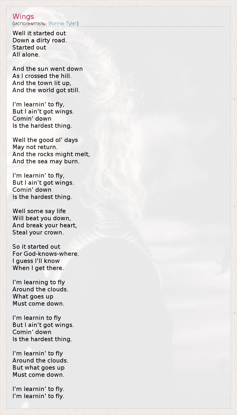 Well it started out Down a dirty road. Started out All alone. And the sun went down As I crossed the hill. And the town lit up, And the world got still. I'm learnin' to fly, But I ain't got wings. Comin' down Is the hardest thing. Well the good ol' days May not return. And the rocks might melt, And the sea may burn. I'm learnin' to fly, But I ain't got wings. Comin' down Is the hardest thing. Well some say life Will beat you down, And break your heart, Steal your crown. So it started out For God-knows-where. I guess I'll know When I get there. I'm learning to fly Around the clouds. What goes up Must come down. I'm learnin to fly But I ain't got wings. Comin' down Is the hardest thing. I'm learnin' to fly Around the clouds. But what goes up Must come down. I'm learnin' to fly. I'm learnin' to fly.