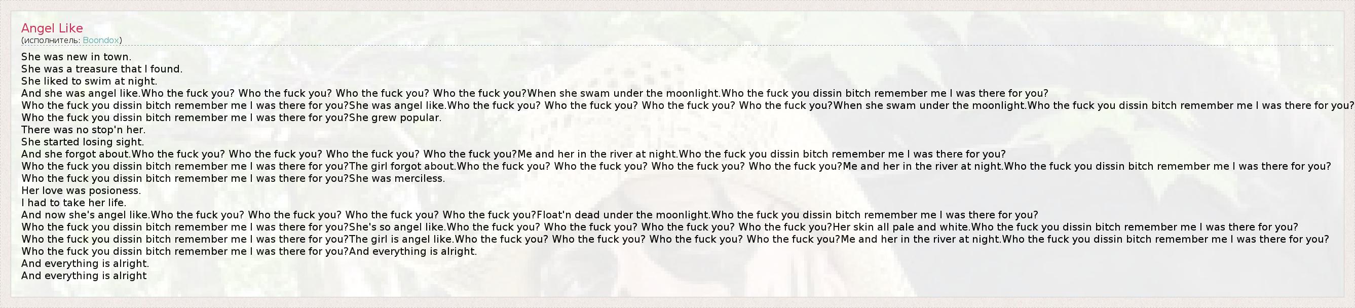 And she was angel like.Who the fuck you? Who the fuck you? Who the fuck you? Who the fuck you?When she swam under the moonlight.Who the fuck you dissin bitch remember me I was there for you?